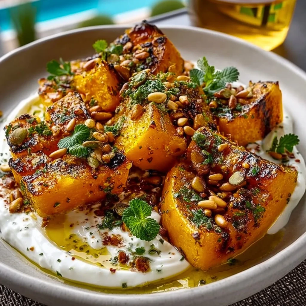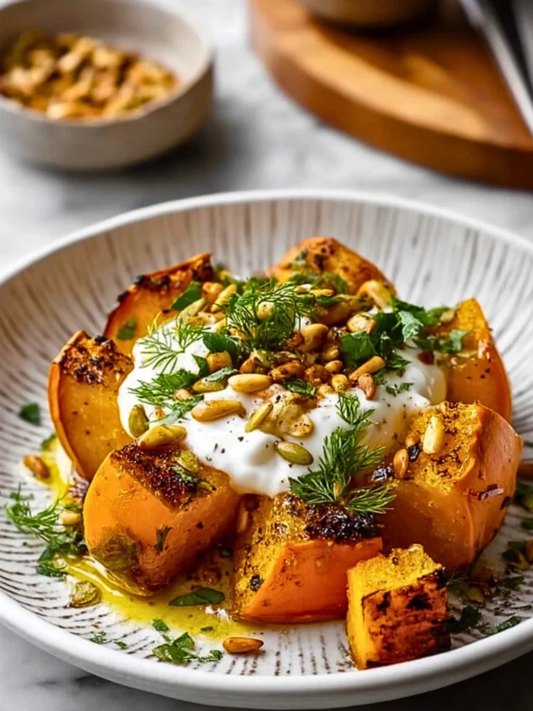 Golden, caramelized cubes of roasted pumpkin rest on a bed of tangy lemon yogurt, all crowned with a generous drizzle of olive oil and a sprinkle of toasted pine nuts. This vibrant dish is bursting with bold Mediterranean flavor, balanced textures, and a gorgeous pop of color. Whether you’re serving it as a standout side or a light vegetarian main, it’s the kind of dish that invites compliments and second helpings.