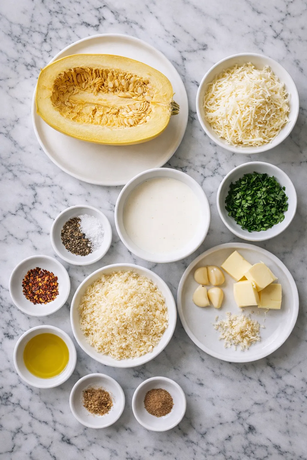 - Spaghetti squash – The star of the dish; roasting it gives you tender, noodle-like strands that hold the creamy sauce.