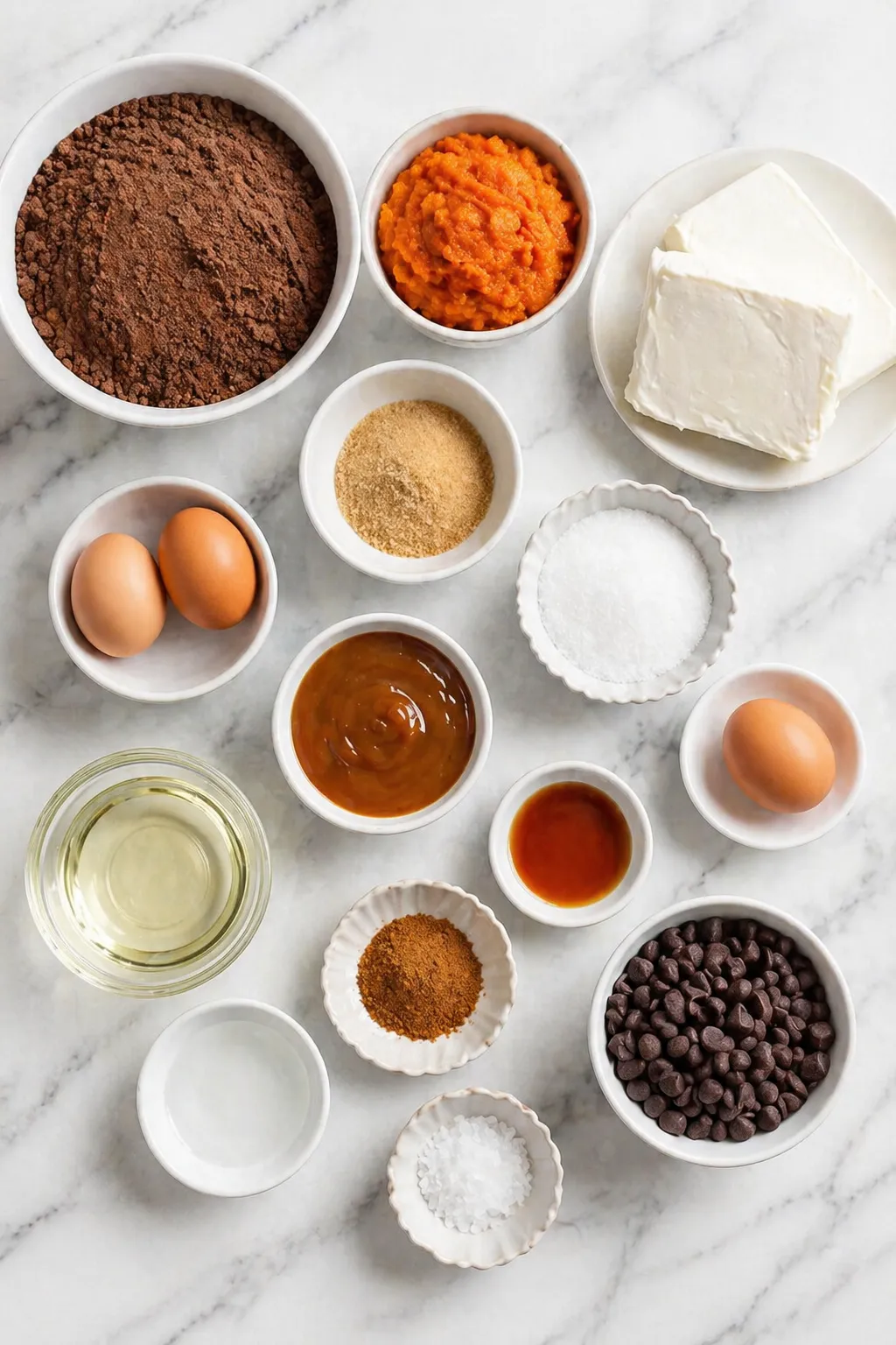 These ingredients build a brownie that is fudgy, creamy, and full of fall flavor. The exact amounts are saved for the printable recipe card, but each item below plays an important role in the texture and taste.
