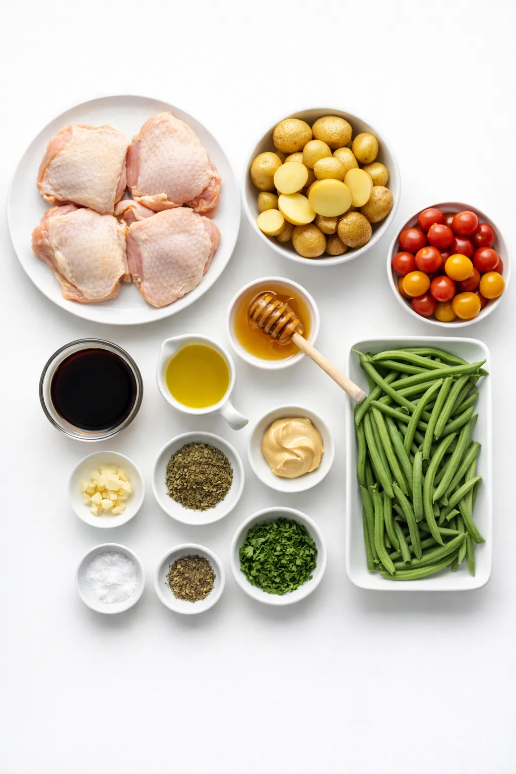 Remove the sheet pan and add the marinated chicken thighs in the center. On the remaining side, add 1 cup cherry tomatoes and 1 cup trimmed green beans. Drizzle the veggies with the remaining balsamic glaze.