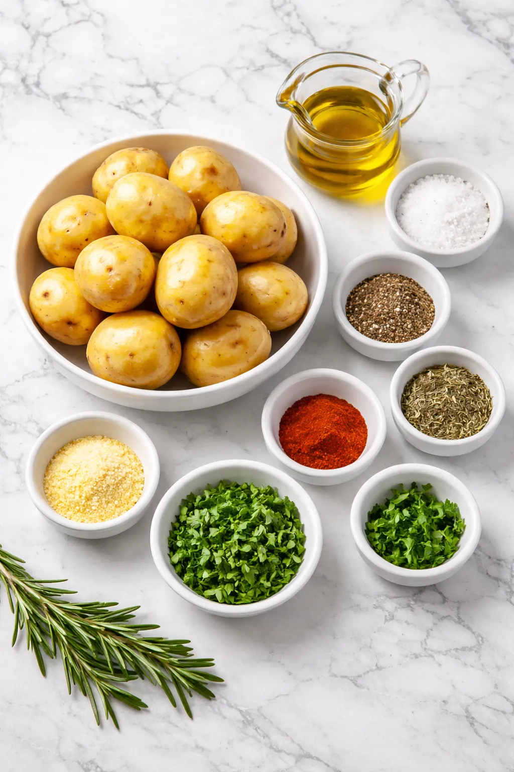 Before you get started, gather a few simple ingredients that build flavor and help the potatoes roast properly. Each one plays a small but important role in creating crisp edges, tender centers, and that rich golden finish.