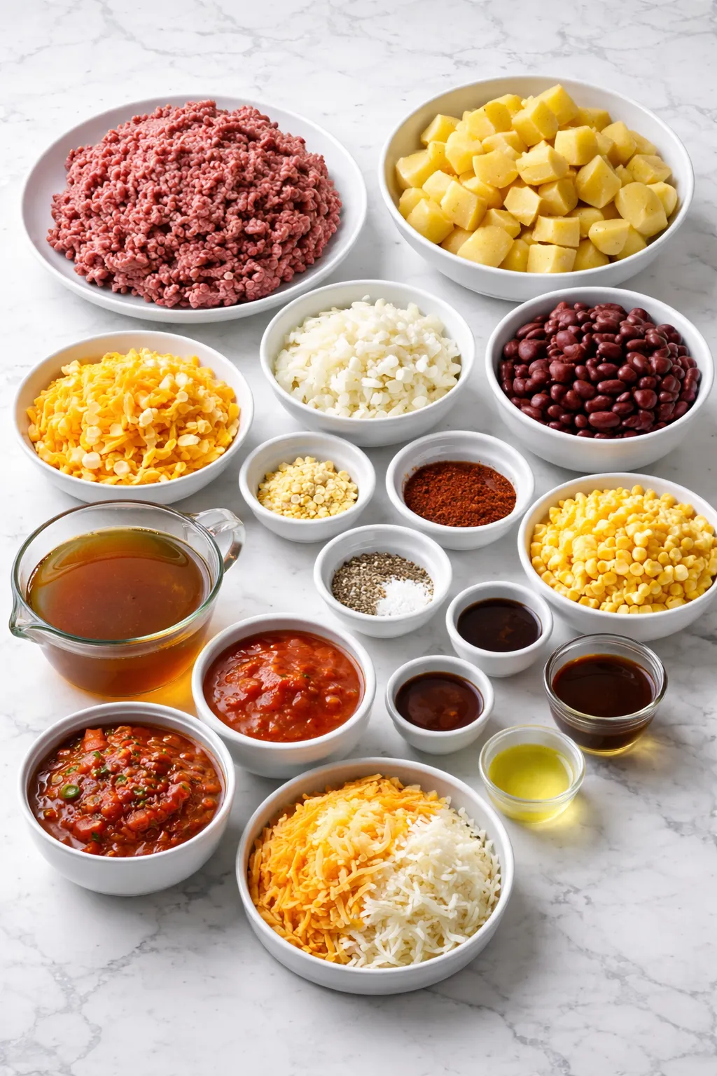 - Ground beef – Provides the hearty, savory base of the casserole.