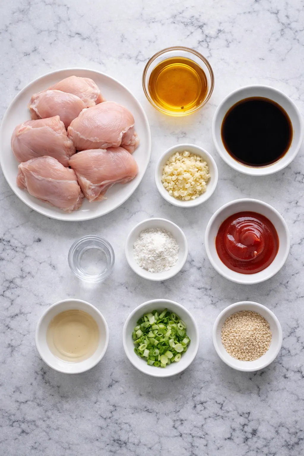 1. In a small bowl, whisk together garlic, honey, soy sauce, ketchup, and rice vinegar.