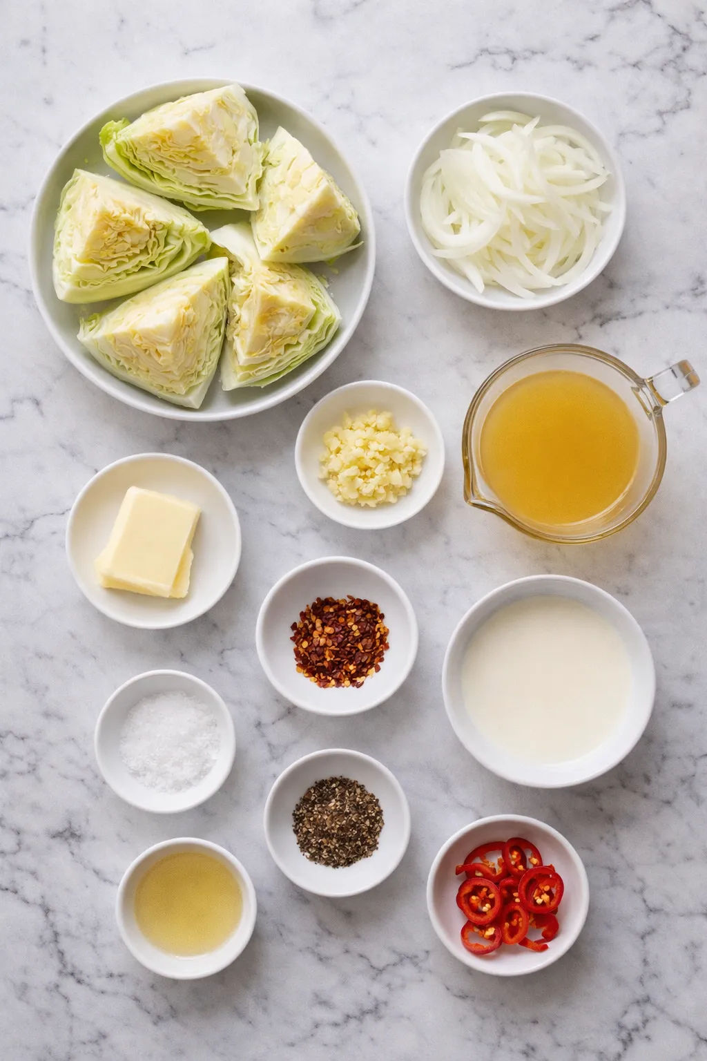 Cut a medium head of green cabbage into wedges, leaving the core intact for structure. In a large skillet, melt butter over medium heat. Add sliced onion and minced garlic, and sauté until softened and fragrant.