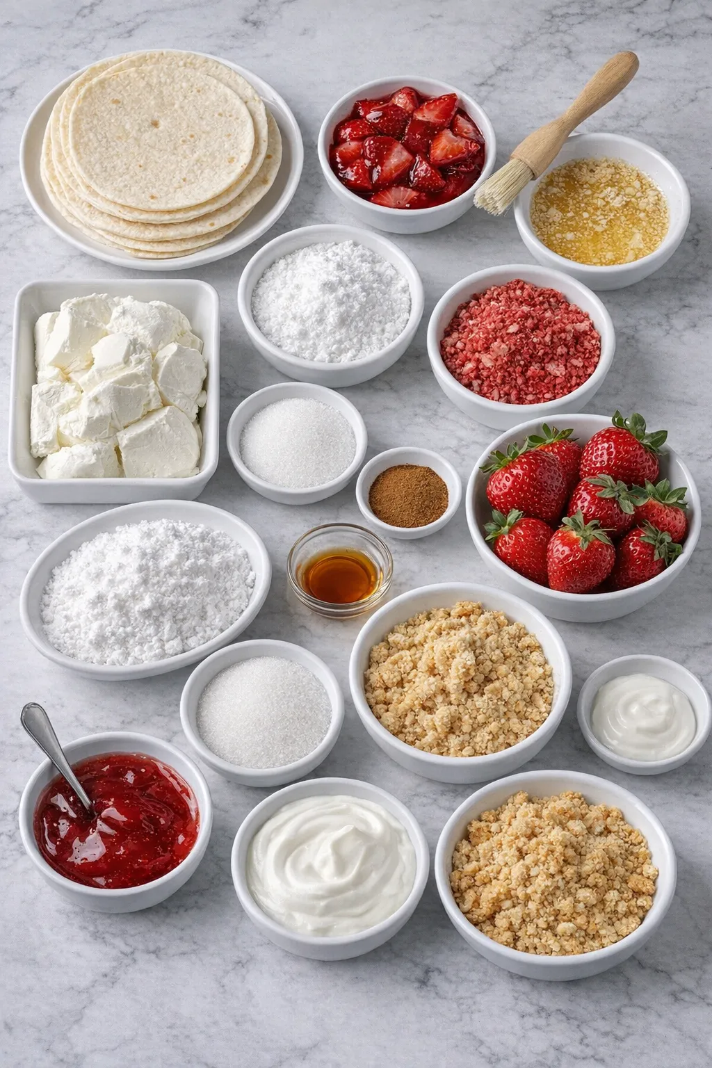 Before you get started, it helps to think of this dessert in three parts: the taco shells, the cheesecake filling, and the strawberry crunch topping. Each ingredient has a specific role in creating the right flavor and texture.