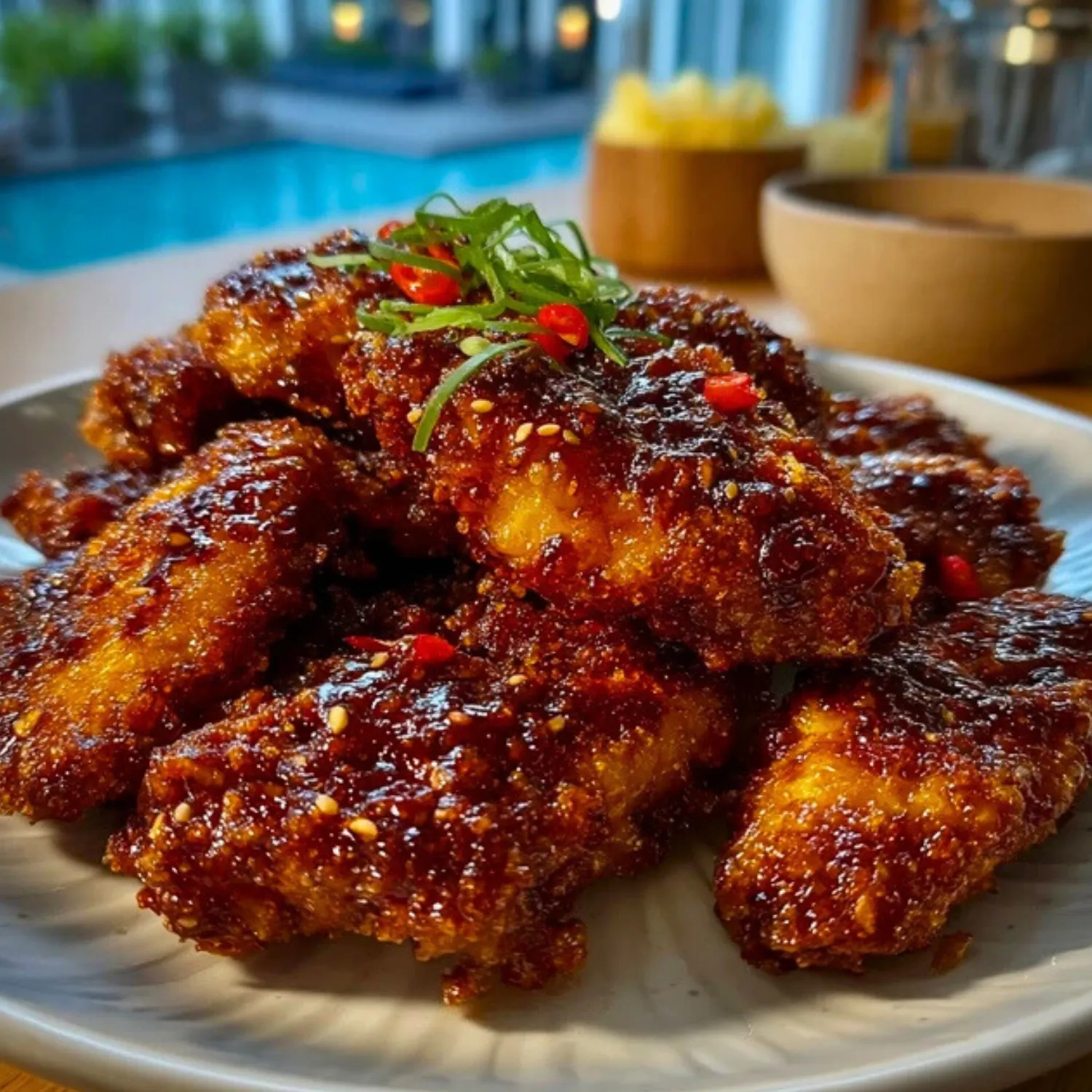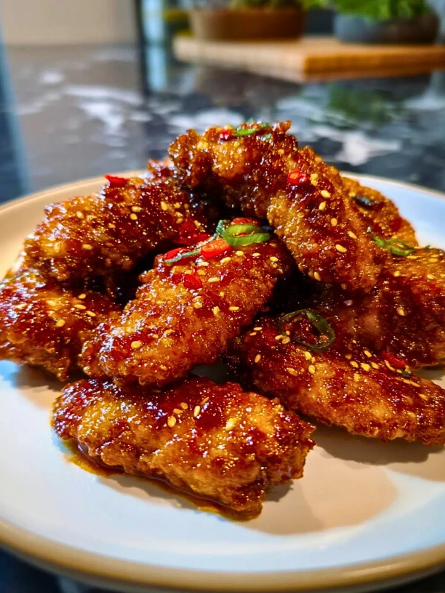 Transfer wings to a serving plate. Sprinkle with sesame seeds and chopped scallions for a pop of color and crunch.