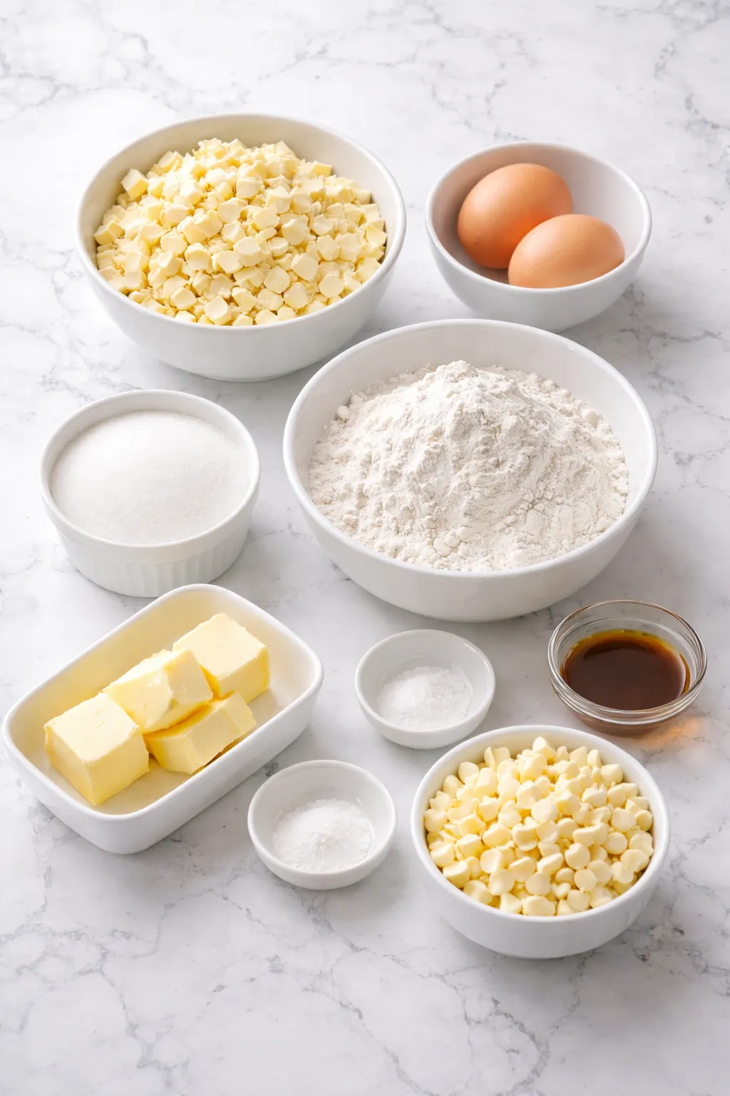 Before you get started, it helps to have every ingredient at room temperature so the batter mixes smoothly and bakes evenly. White chocolate is the star here, but each ingredient plays an important part in creating that soft, chewy texture and rich flavor.