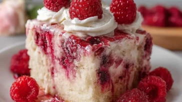 The texture pairing matters too. Melted white chocolate and a rich frosting create a silky finish, while raspberries soften into juicy bursts throughout the cake. That mix of tender crumb, creamy topping, and berry pockets is what makes this dessert so memorable.